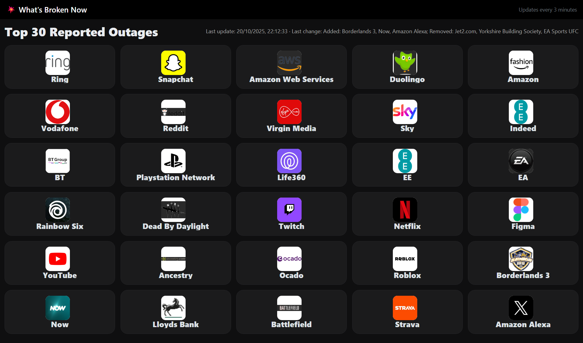 It’s a single, dark-mode page with five neatly spaced cards across (appropriate for a large screen). The logo is on the left, the name is on the right, and there is a simple header that shows when the list was last updated and changed. There are no graphs or faff – just a quick overview of “what’s broken currently.”